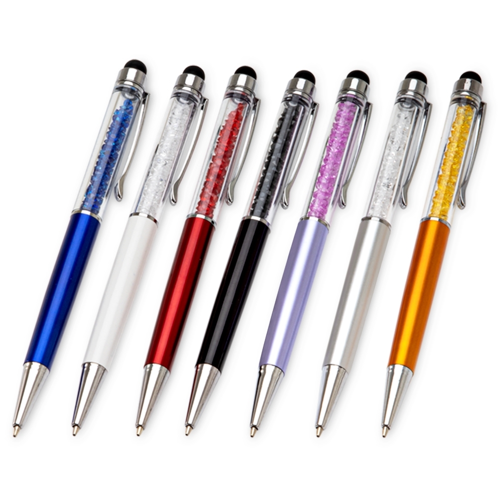 Descrição: Caneta plástica com touch screen e detalhes em cristal, acionamento por rotação e carga esferográfica azul 1mm.